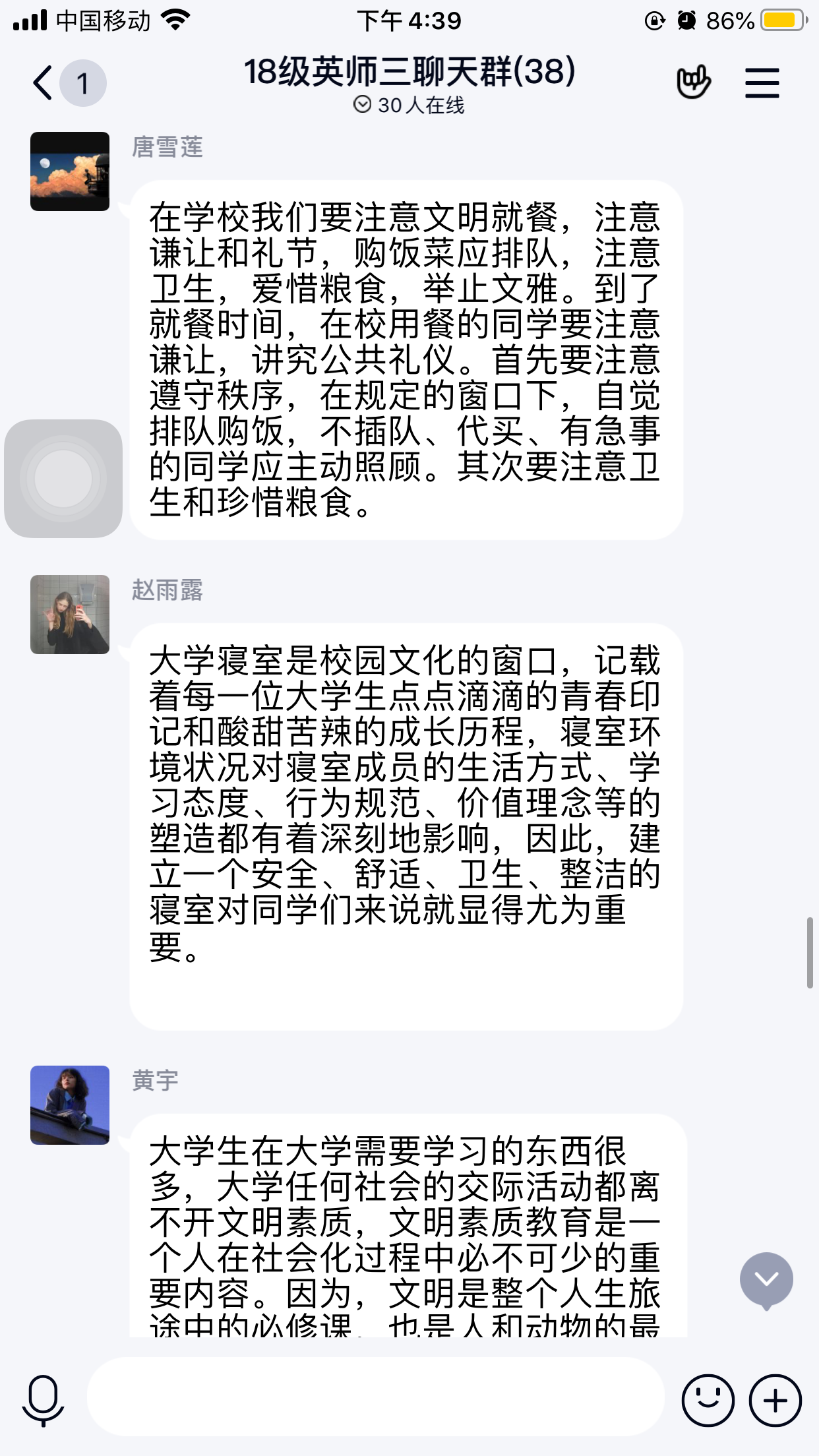 2018级英语4班的王丹同学分享看法:“文明礼仪养成教育不仅是个体道德、品质和个性形成的基础教育,也是提高全民族道德素质、振兴民族精神及建设社会主义精神文明的基础教育。作为新时代老员工,我们应该有良好的文化文明与综合素质。”