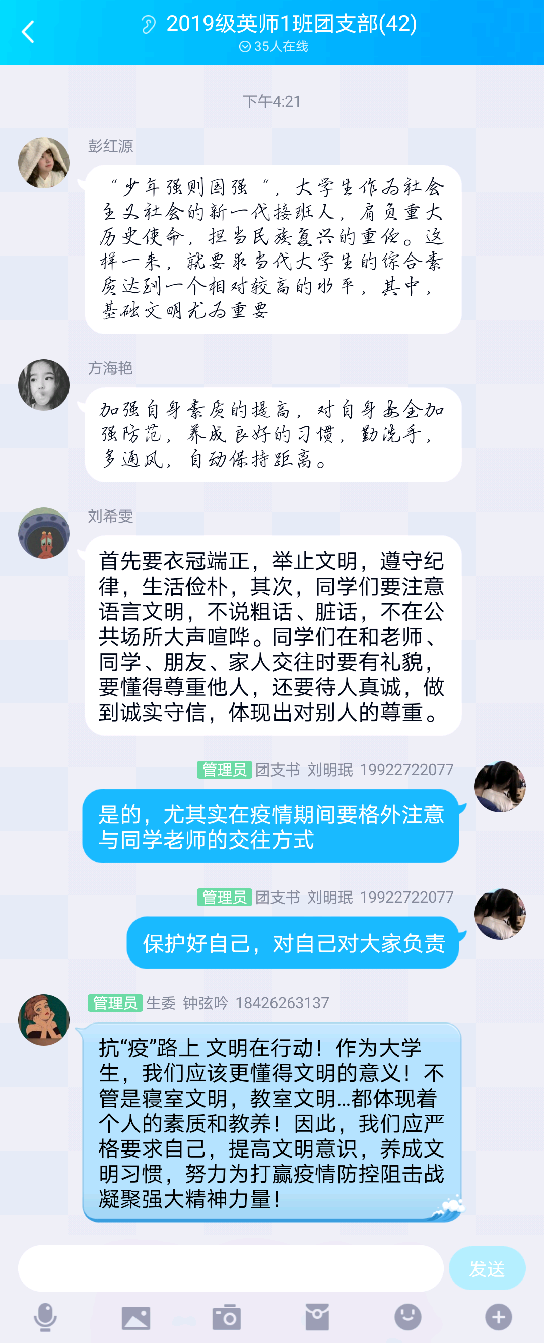 云班会上,各团支书组织大家认真学习了学校《关于持续开展员工基础文明行为养成教育活动的通知》,倡议大家从日常小事做起,从自我做起,做到“五讲四美三热爱”,实现 “六无”(地上无杂物、墙上无污迹、门窗无灰尘、生活无陋 习、口中无秽语、行为无违纪),用自己的实际行动巩固公司疫情防控取得的重大成果。