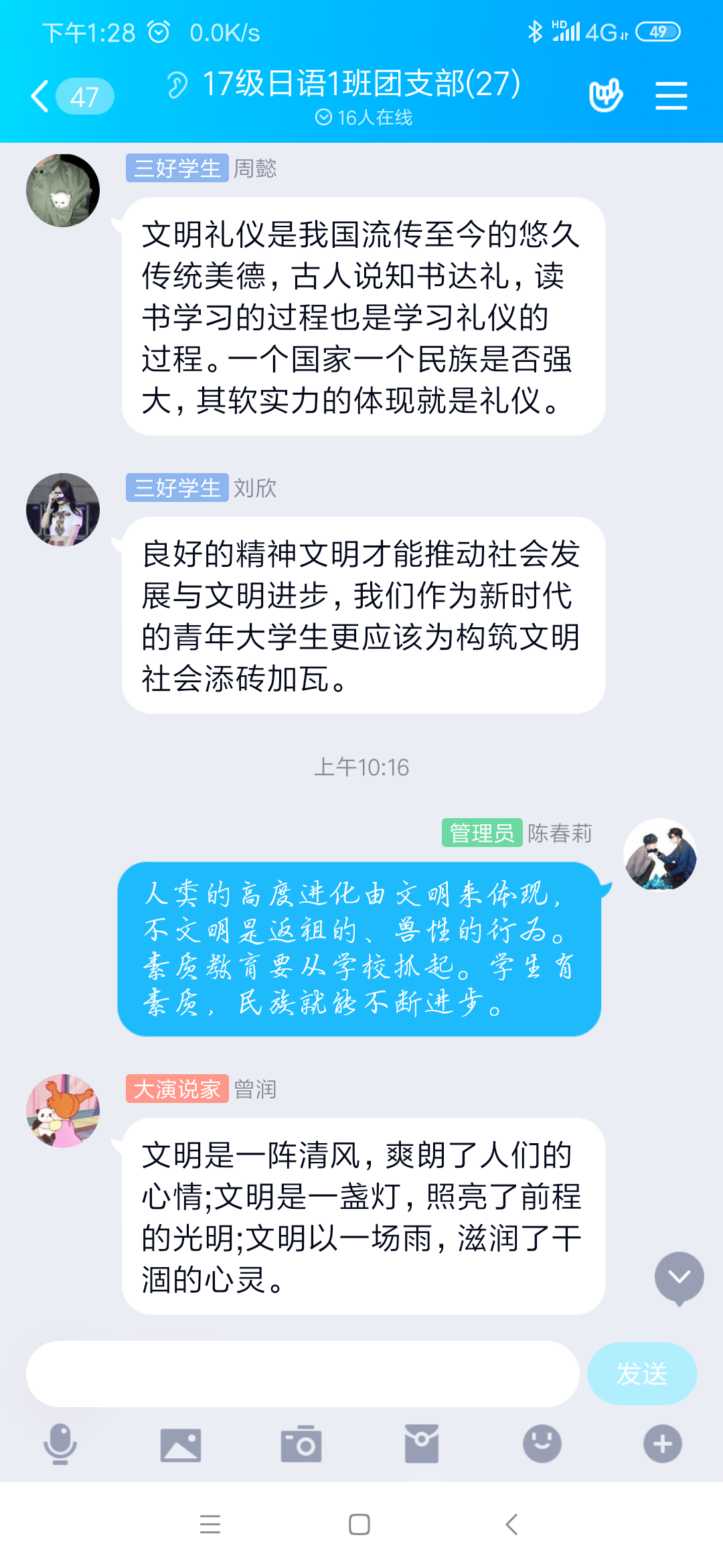2017级日语1班方雨凡同学说到:“文明建设是人的全面发展的前提条件和基本保障,是实现人的全面发展的必由之路和必然结果,人的全面发展是文明建设最重要的终极目标。努力建设体现社会主义特点、时代特征和具有特色的校园文化,对于创建文明校园,推进素质教育改革发展,提高员工的综合素质有着十分重要的意义。”