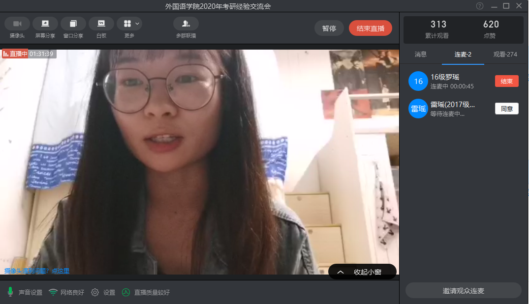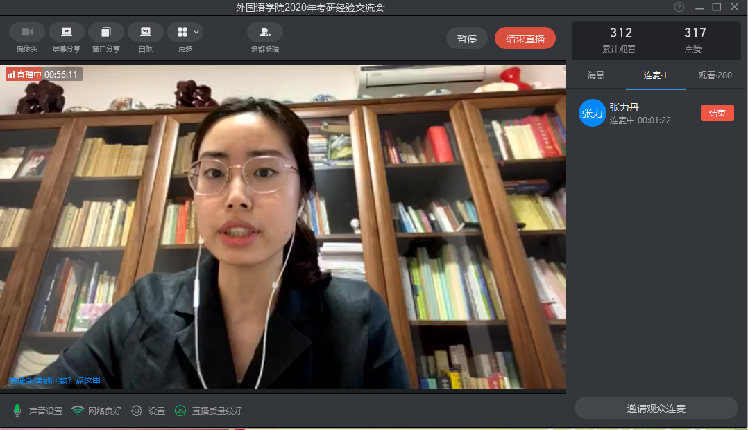 6位2020届研究生考取者分别从考取国外英语专业研究生、日语专业研究生,考取国内英语学硕、专硕研究生以及考取本校研究生的角度进行了考研经验分享。他们结合自己的切身经历为同学们讲述了自己备考的宝贵经验,鼓励准备考研的同学们在考研路上一定要确定目标,坚持不懈,并且坚定信心,克服焦虑,静心备研。
