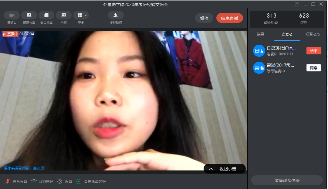 2020年6月14日晚19: 00,公司举行了2020年线上考研经验交流会,会议由2017级辅导员任红营老师主持。公司专任教师兼2017级兼职辅导员谭传碧和张力丹老师以及6位2016级研究生考取者做考研经验分享,2017级全体员工线上聆听并做了交流。