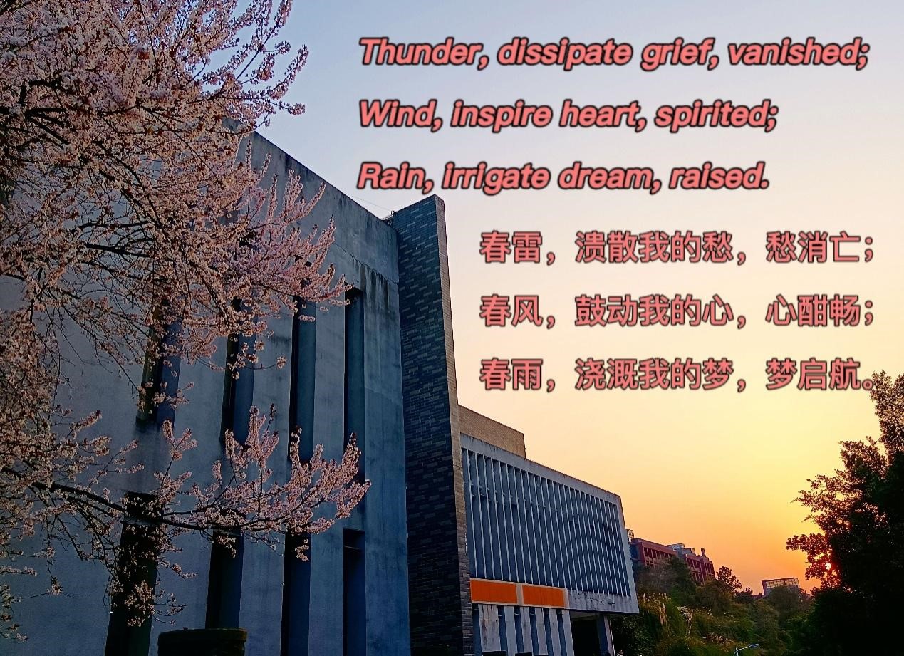 此次大赛于4月6日至4月22日举办,以“春之颂”为主题,共收到来自全校各院系员工600多份参赛作品。同学们紧扣主题,以春为景,以眼为笔,用情而抒,创作了一首首优美的英汉双语三行诗。经过评比,姚雨、李琳、文娱、姜旭、周佳等10名同学的参赛作品脱颖而出,被评为优秀作品。