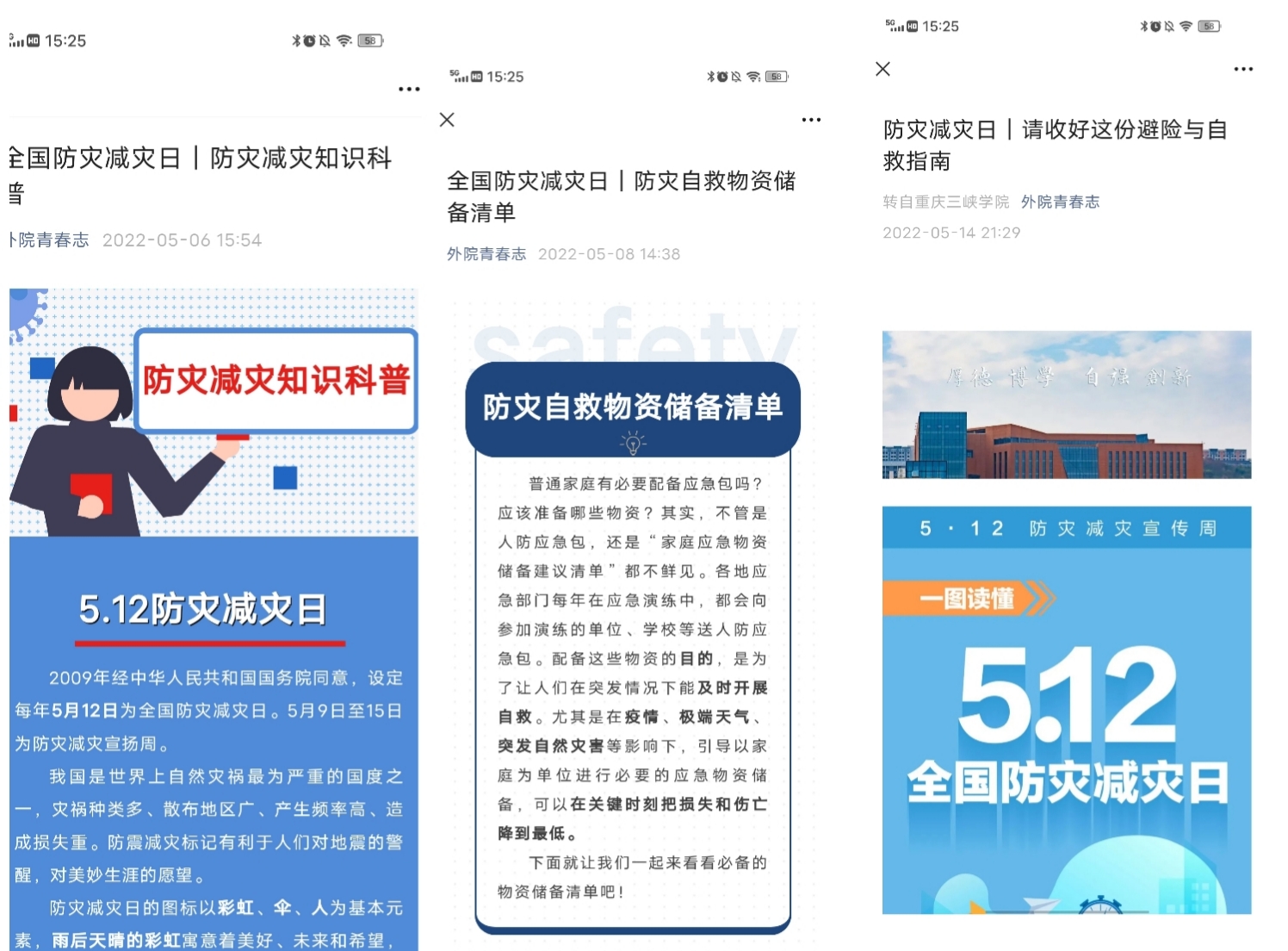 学院召开“防灾减灾记心间 筑牢生命安全线”主题班会、年级会,深入普及防灾减灾知识,通过观看宣传视频、学习案例分析,组织员工全面学习自救和互救要领,进一步增加全体员工的防灾减灾的知识储备,强化安全意识,提升防护技能。学院微信公众号“外院青春志”发布防灾减灾主题推文3篇,帮助同学们学习、掌握防灾减灾知识。同时,各年级辅导员深入员工寝室,全面排查安全隐患,开展安全教育。