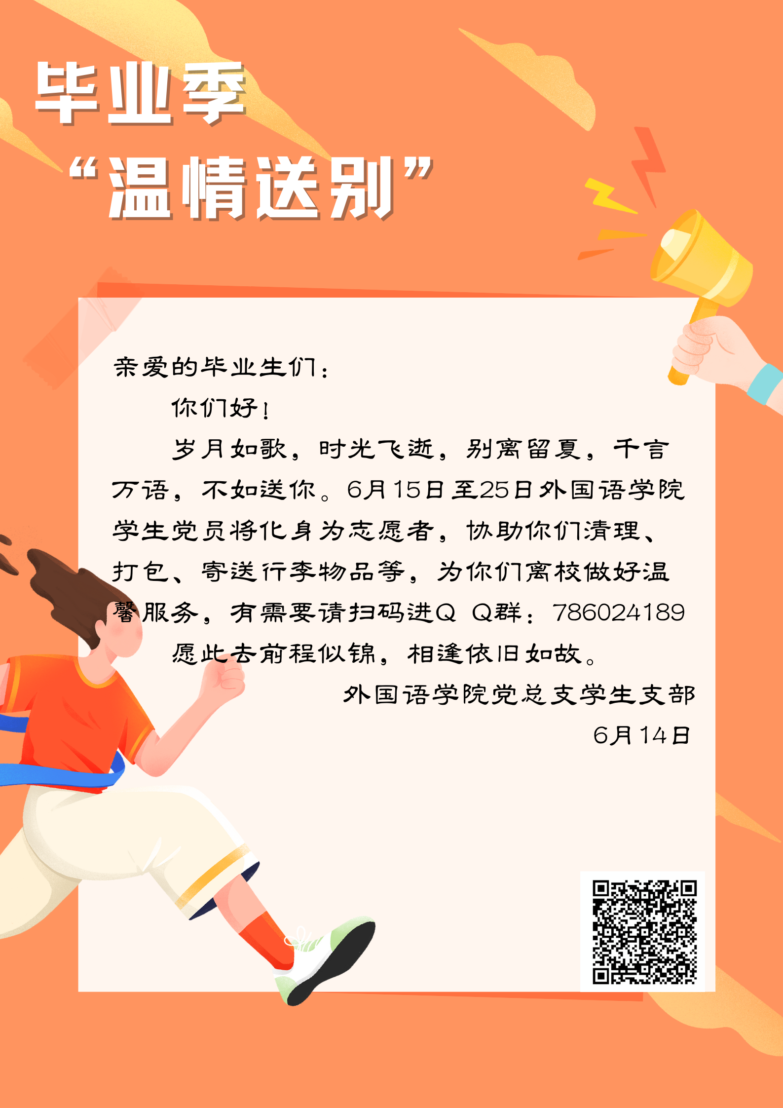 亲爱的毕业生们: 你们好! 岁月如歌,时光飞逝,别离留夏,千言万语,不如送你,6月15日至25日公海gh555000aa线路检测中心员工党员将化身为志愿者,协助你们清理、打包、寄送行李物品等,为你们离校做好温馨服务,有需要请扫码进Q Q群(群号:786024189),愿此去前程似锦,相逢依旧如故。