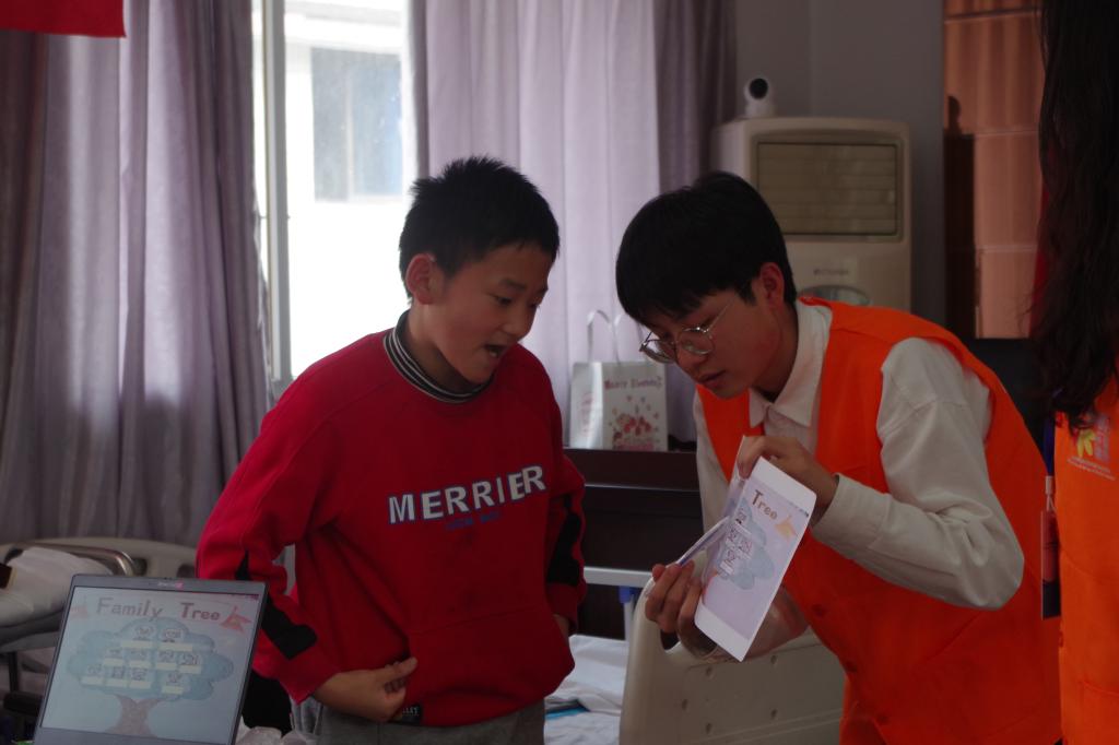 志愿者通过英文小短片《Peppa Pig》将小朋友们带入轻松有趣的英语小课堂,以“my family members”为主题,利用卡通图片中英对照教学,寓教于乐。小朋友兴致盎然,大声跟读,积极互动,课堂氛围轻松活跃。课程结束后,志愿者还组织孩子们开展了“连连看”、“猜猜词”等趣味活动,孩子们在游戏中加深了对单词的记忆。
