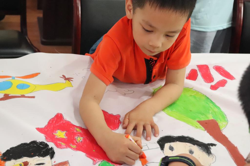 在学习完英文诗歌后,宣讲团志愿者组织小朋友们开展了“手绘新时代,童心爱祖国”主题绘画活动。长长的画卷一字排开,小朋友们以画为笔,以爱为筏,进行绘画创作。一个个“小画家”专心致志地勾勒祖国山河,争相用五彩的画笔绘制出心中缤纷的祖国。不一会儿,孩子们仰起红扑扑的脸颊,挥舞着彩色的手,骄傲的展示着他们心中的祖国:鲜艳的五星红旗、雄伟壮丽的天安门、蜿蜒盘旋的长城、能歌善舞的民族同胞……