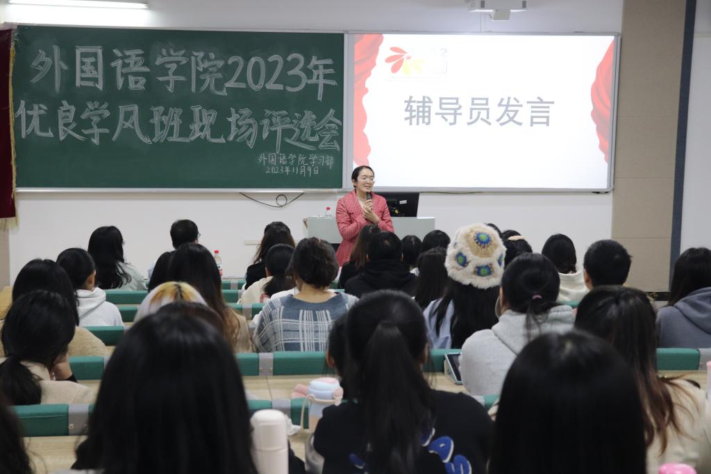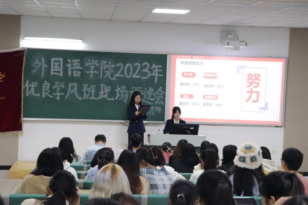 评选现场,各班级代表通过PPT、视频、文字等方式,展示了本班在本年度思想建设、学风建设、文体活动等各个方面的创建成果。孔云军对所有班级在过去的创建中所取得的成绩表示了肯定和赞扬,并鼓励同学们进一步营造班级团结互助的良好氛围,共同把班级大家庭建设得更好。