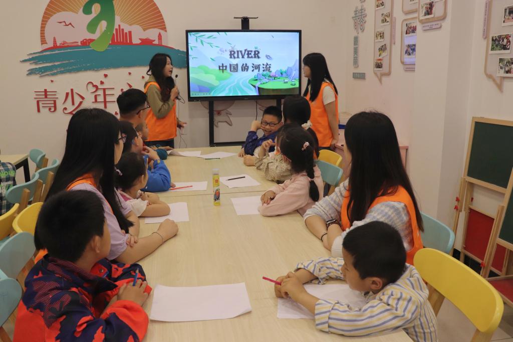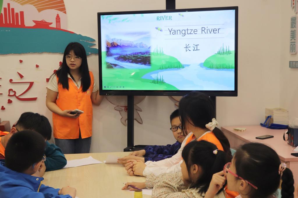 本次课堂主题为“Protect the Yangtze River”。志愿者不但教授了保护长江有关的英语单词,如“plastic”“water”“resource”,还引导小朋友们根据理解,结合实际,设计出“长江保护”的主题标语。