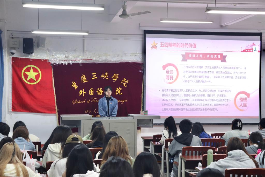 活动在《光荣啊,中国共青团》高亢的旋律中拉开了帷幕。全体同学在学院团总支员工副书记王博冉同学的组织下,集体观看视频《有我》。优秀共青团员代表吴冬、优秀共青团干部代表万瑜婷讲述了五四精神的内涵和五四运动中涌现出的先进青年的英勇事迹,参会的团员积极分享此次活动的感悟。