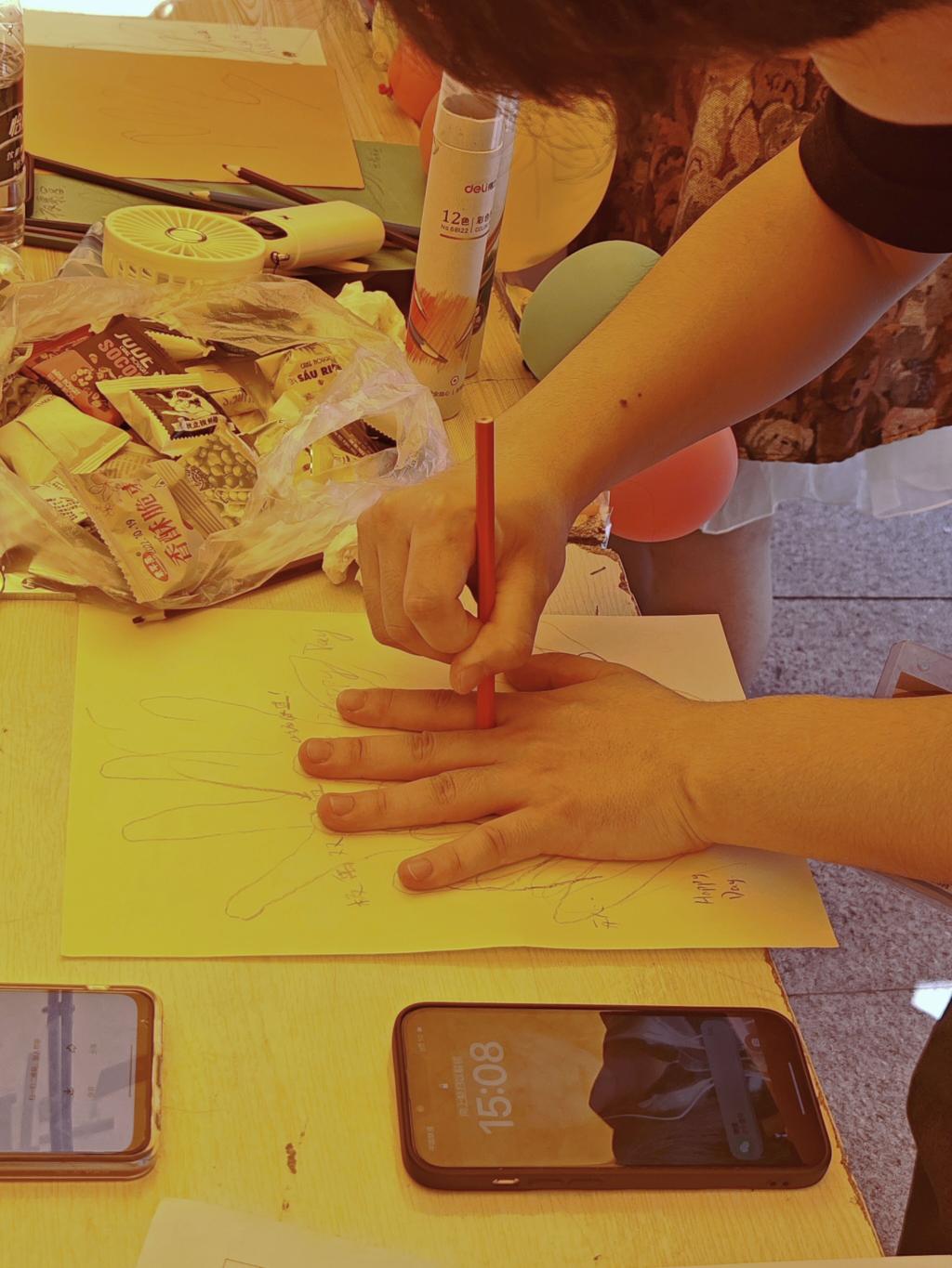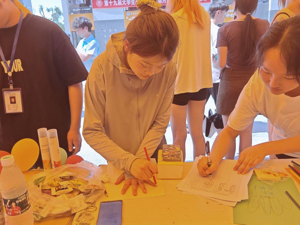 伴随着优美动听的音乐声,同学们投入到有趣的活动中。现场不仅设有吹乒乓球和踩气球等快节奏解压小游戏,也设有别具风味的“掌心祝福,纸间传递”共绘手掌活动。同学们用彩铅在纸张上描出自己的手掌轮廓,使五颜六色、轮廓不一的手掌汇聚在一起,让大家进一步亲近和了解彼此。最后,他们还写下一句又一句祝福语:“顺顺利利,平安喜乐”“我一定会上岸!”,字里行间表达着其对生活的美好期许。