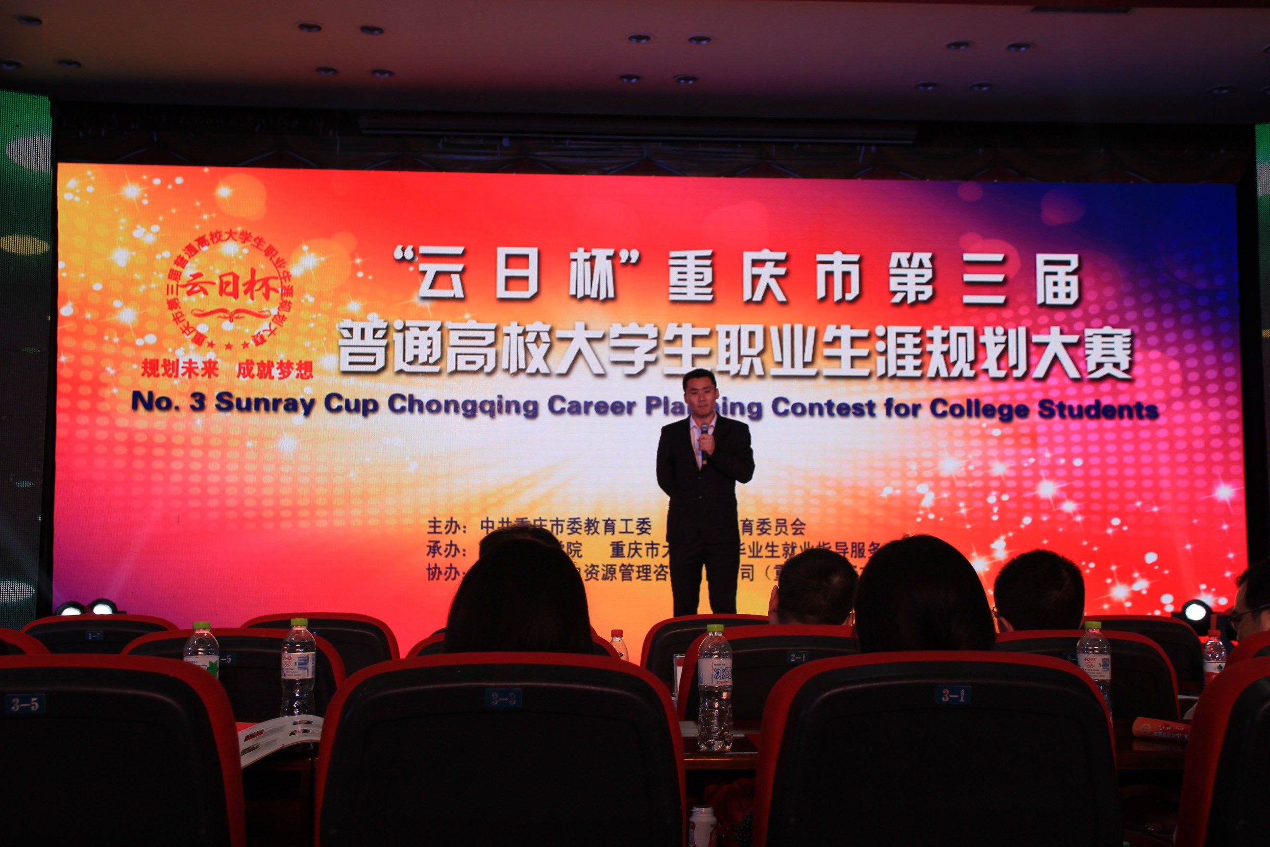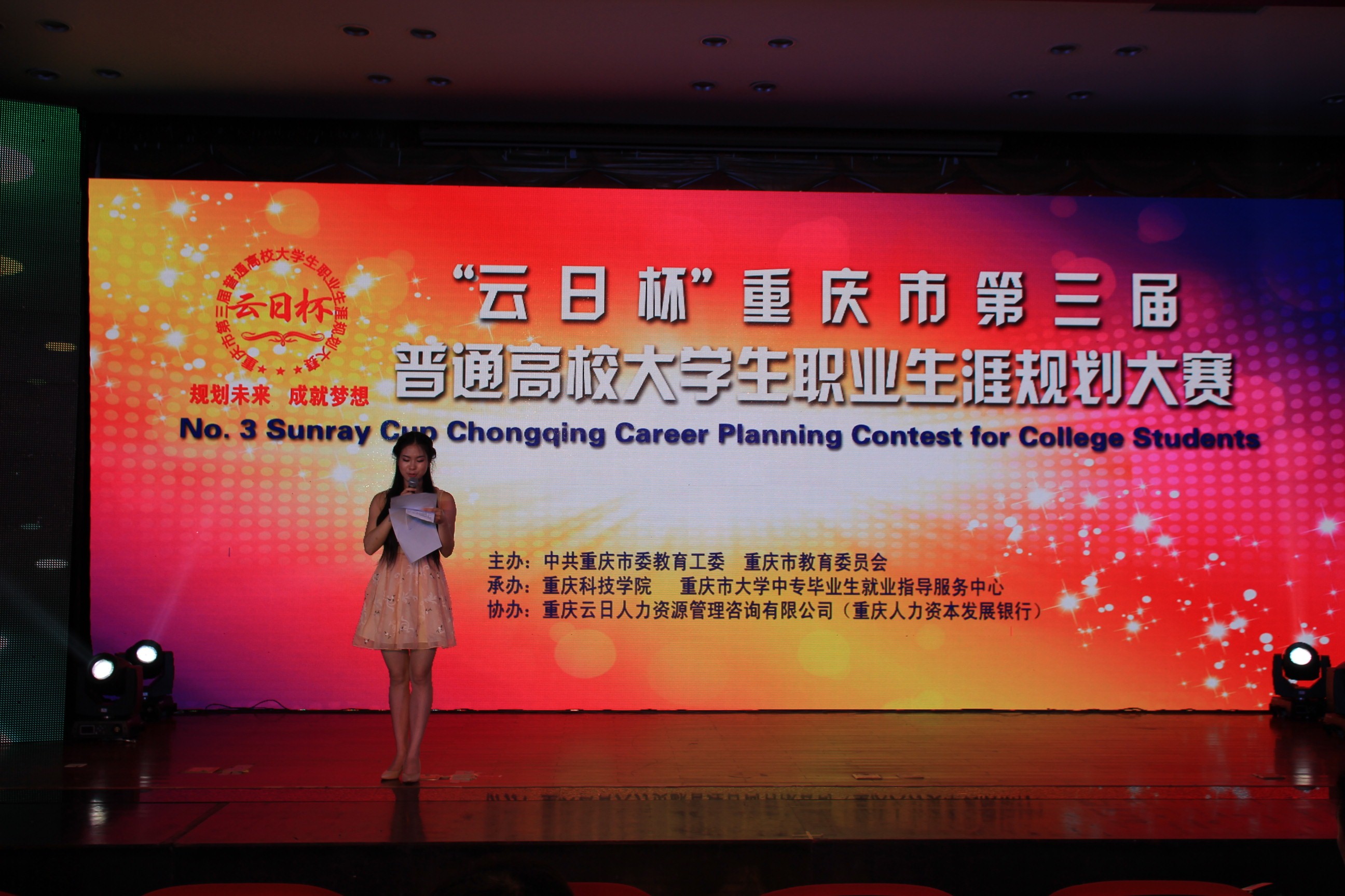 由重庆市市委教育工委、市教委办主办,重庆市大中专毕业生就业指导中心、重庆科技学院承办,重庆云日人力资源管理咨询有限公司独家冠名并协办的“云日杯”重庆市第三届普通高校老员工职业生涯规划大赛决赛于6月18日上午九点在重庆科技学院学术报告厅隆重举行。来自重庆大学的雷宏杰和高楠同学分别获得了大赛的二等奖和三等奖,同时雷宏杰同学还获得了大赛的最佳风采奖,重庆大学获得优秀组织奖,建筑城规学院陈兰老师获得优秀指导老师奖。