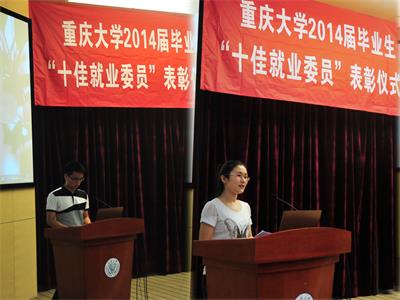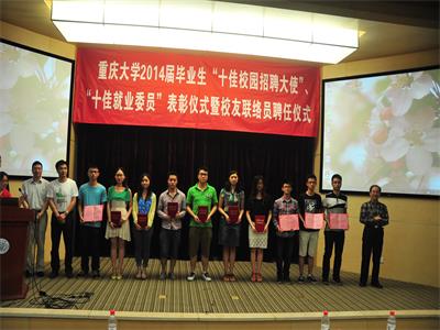 2014年6月20日,由重庆大学员工总会主办的重庆大学2014届毕业生“十佳校园招聘大使”、“十佳就业委员”表彰仪式暨员工联络员聘任仪式在A区国际会议厅成功召开。重庆大学党委副书记肖铁岩、党委学工部部长严太华、重庆大学员工总会秘书长许骏等出席了会议,来自各个学院的200多名2014届员工联络员参与了会议。此次大会肯定了过去一年公司的毕业生就业工作并对其中表现突出的员工干部进行表彰。